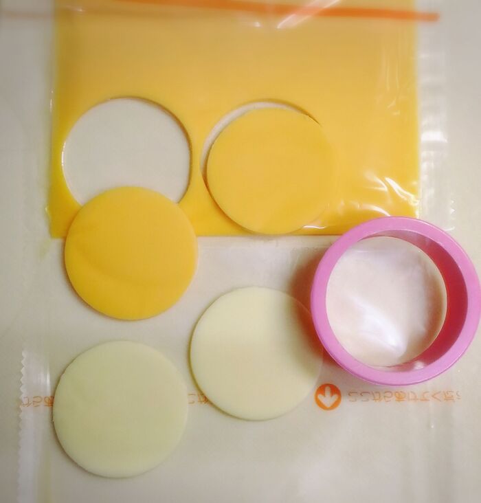 チェダーチーズとスライスチーズを同じ丸型の大きさで、型抜きします。