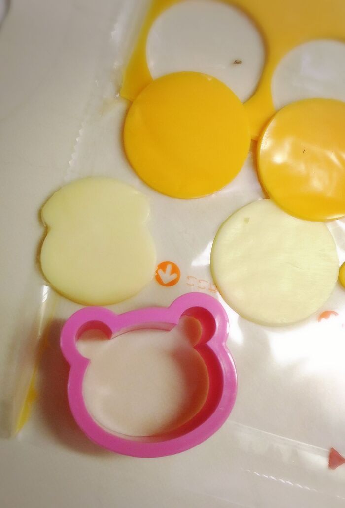 スライスチーズの方だけ、クマ型の端を使って顔の輪郭を型どります。