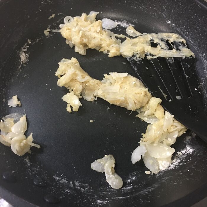 玉ねぎがしんなりしたら火を止めて薄力粉を入れて玉ねぎに馴染ませます。