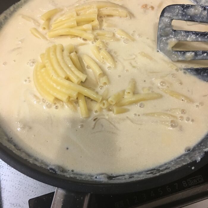 塩胡椒を入れて味を整えて、マカロニを入れたら火を止めます。