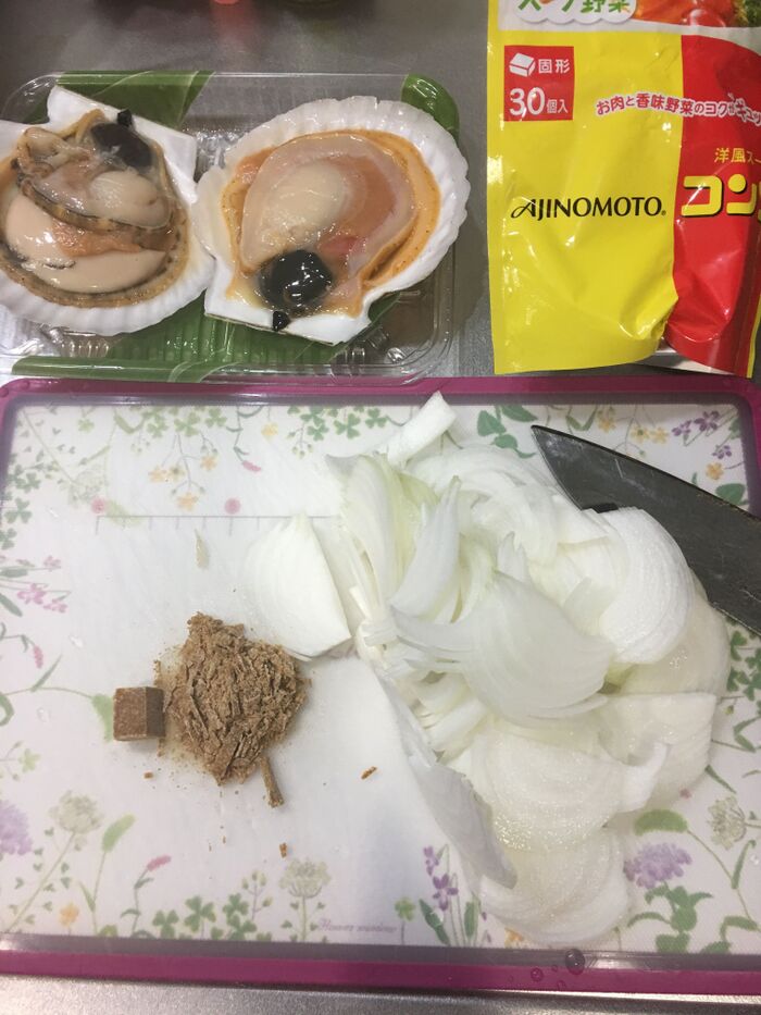 玉ねぎをスライスし、コンソメキューブは包丁で切ると粉々になります。