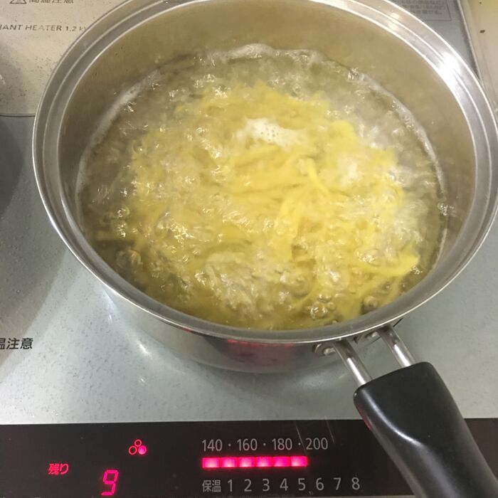 マカロニを袋に記載の時間茹でてください。