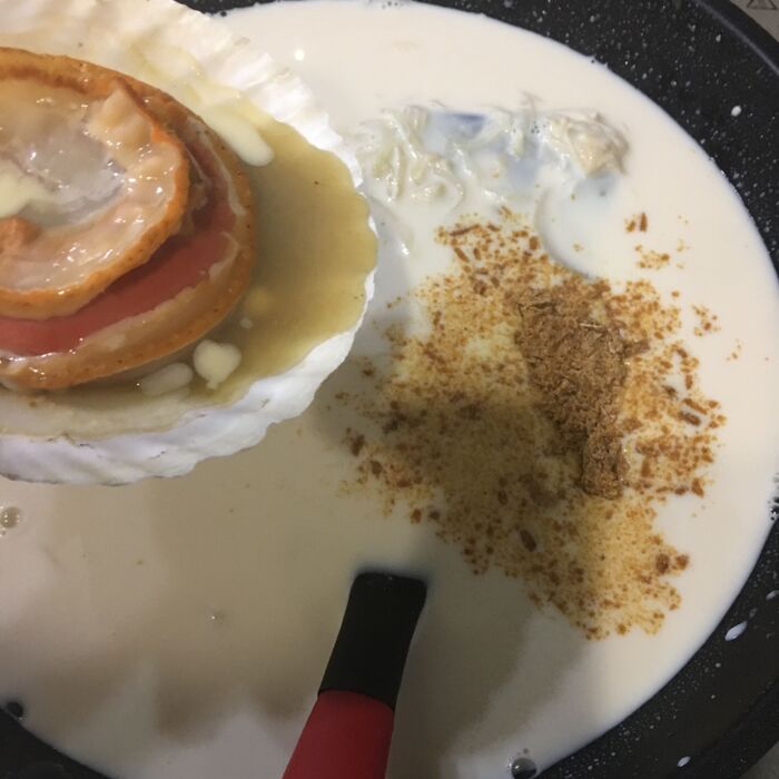 とろみがつきだしたらコンソメとホタテを焼いたらスープが出るので投入します。