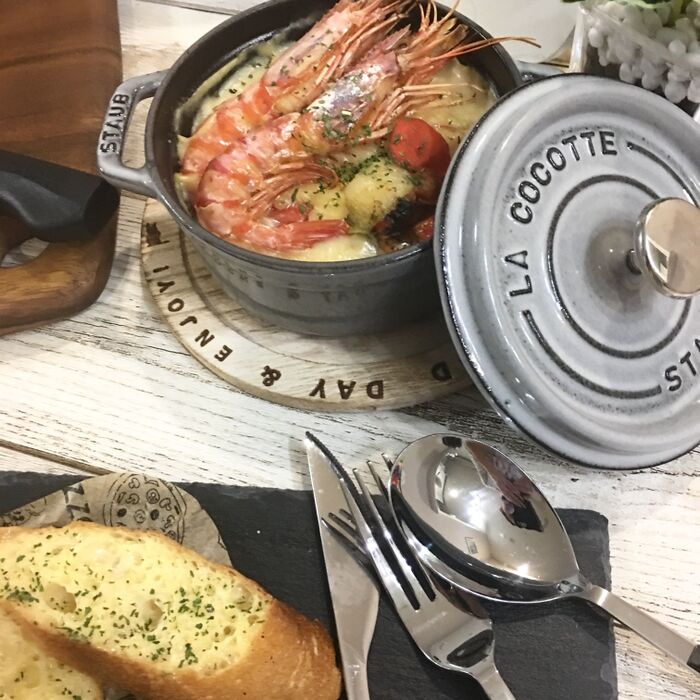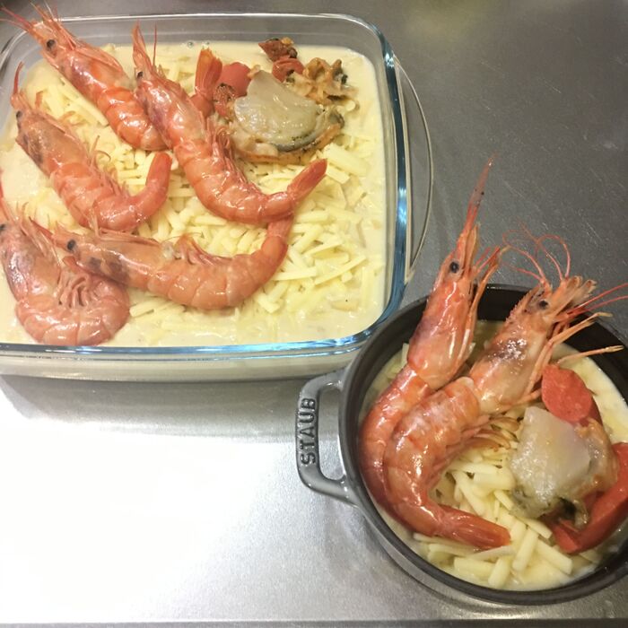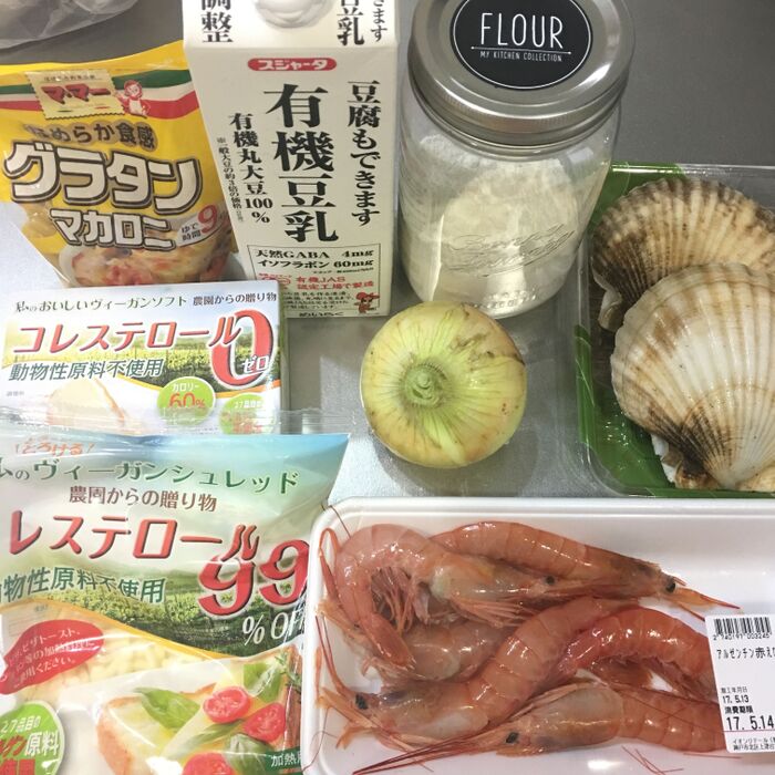 ホタテは角切りにして入れてヴィーガンシュレッドチーズをたっぷりのせて、海老ものせて250度で焼き色がつけば完成です(⁎˃ᴗ˂⁎)