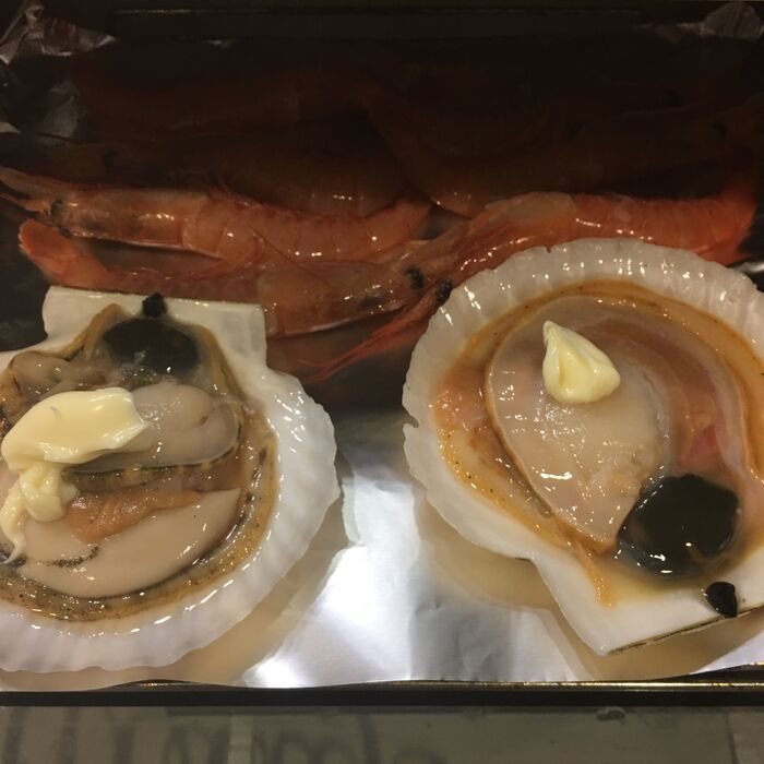 炒めている間にホタテにソフトをのせて赤海老と一緒に250度で10分焼きます。