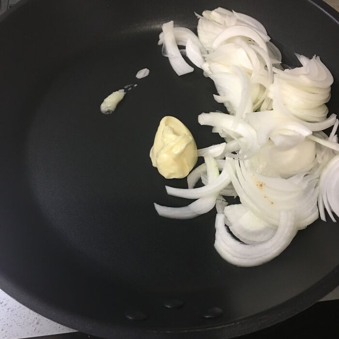 フライパンにヴィーガンソフト、玉ねぎ、ニンニクを入れて炒めます。