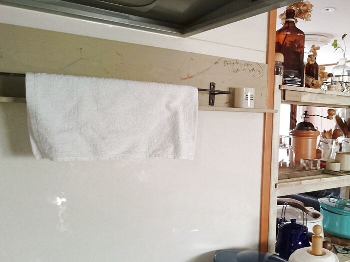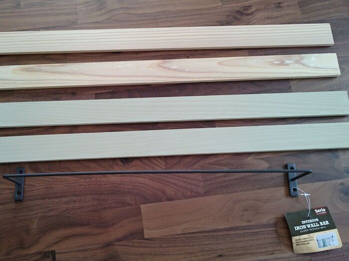 L字で作ったのはちょっとした小物が飾れるようにです♪横の棚の幅が短いのでタオルに当たらず干すことができます^^