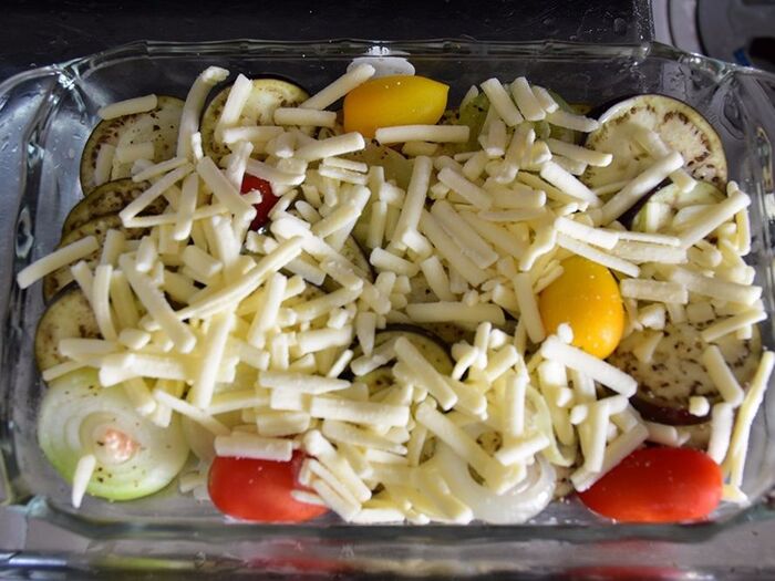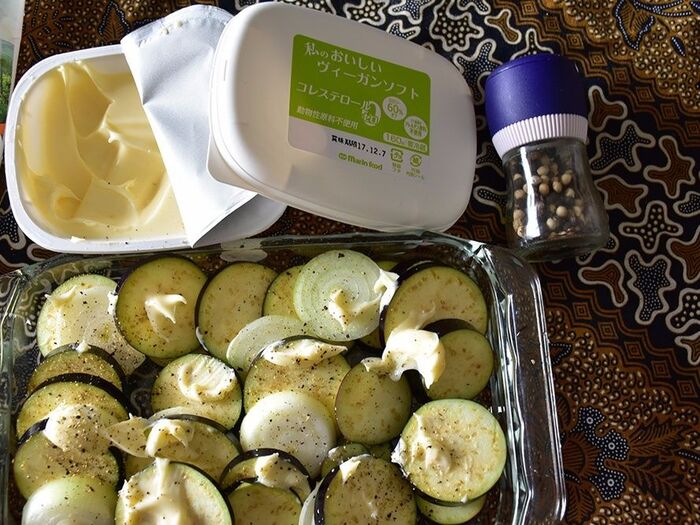 1:ナスと小たまねぎは1.5センチ幅に切り、耐熱器に並べ、白ワインを振りかける。