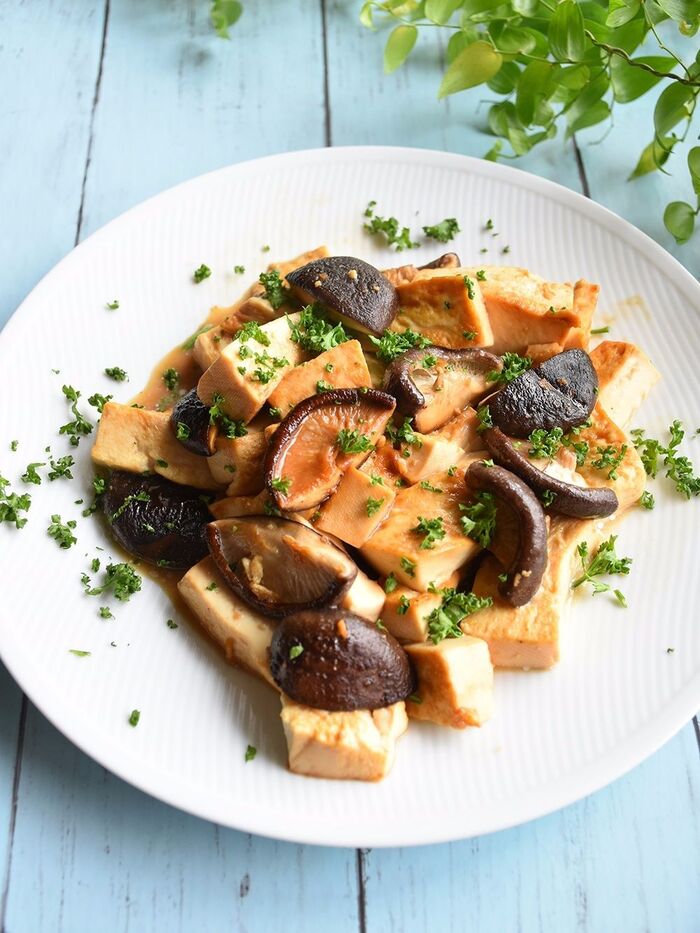 1:フライパンにオリーブオイルを入れ熱し、しいたけ、木綿豆腐、すりおろし生姜を入れ炒める。