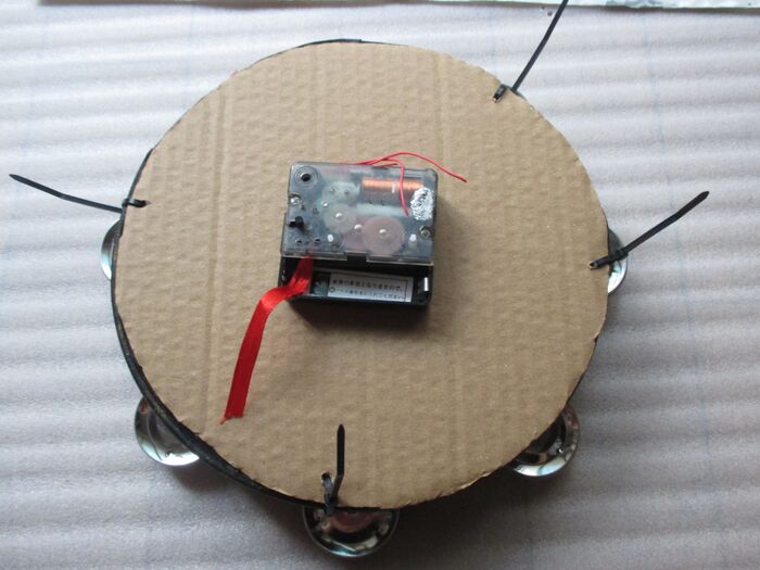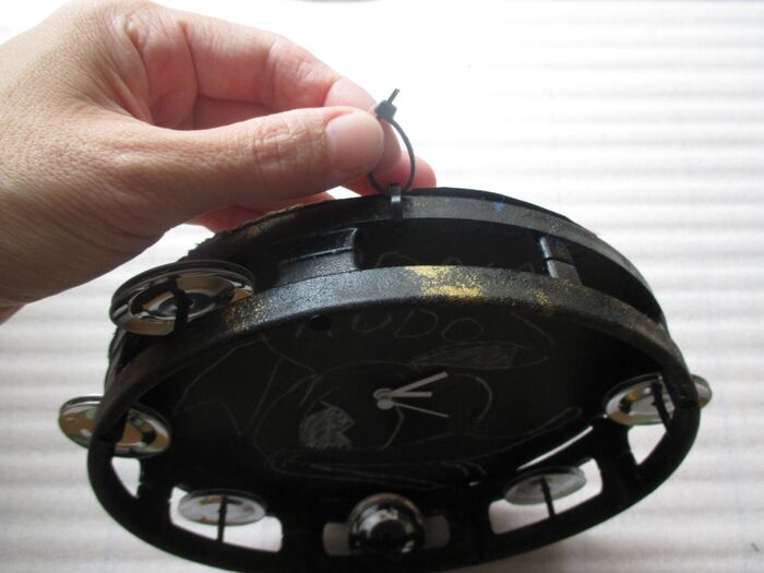 銀色の音が鳴るところに、結束バンドが隠れるように穴をあける。