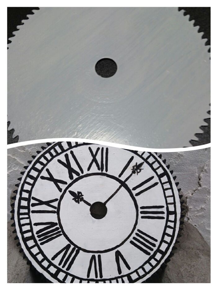 古くなったチップソー(草刈りに使う刃)は、白くペイントして、時計を書きます。