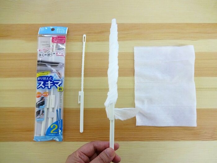 「取り替え式スキマ棒」はプラスチック製の棒に付属のシートがおうちにあるフローリングワイパーのシートを巻き付けて使うもの。
