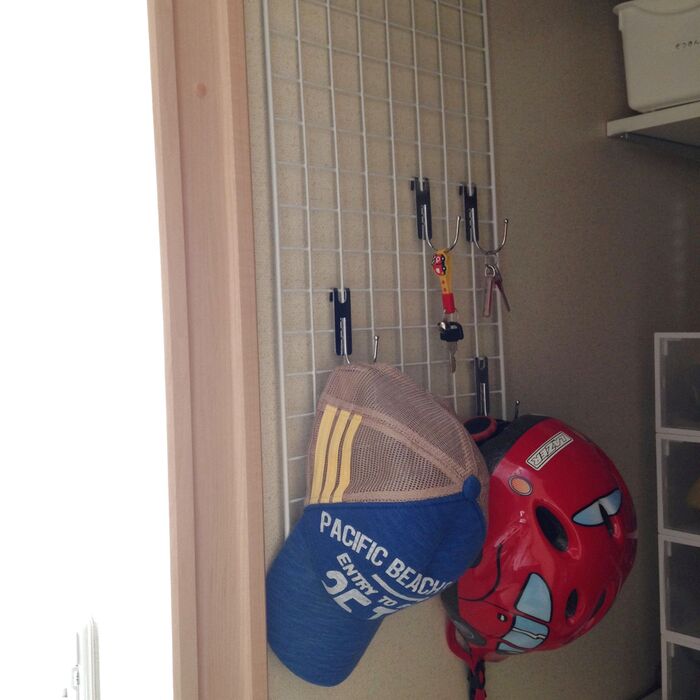意外に置き場に困るヘルメットや帽子もクローゼットの壁面を活用するとすっきり収まります。