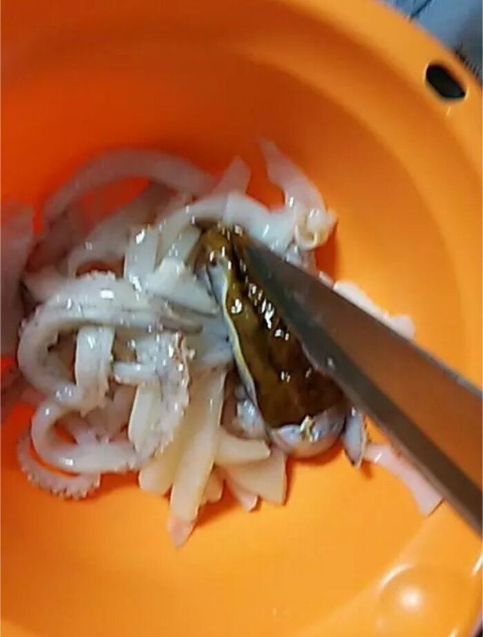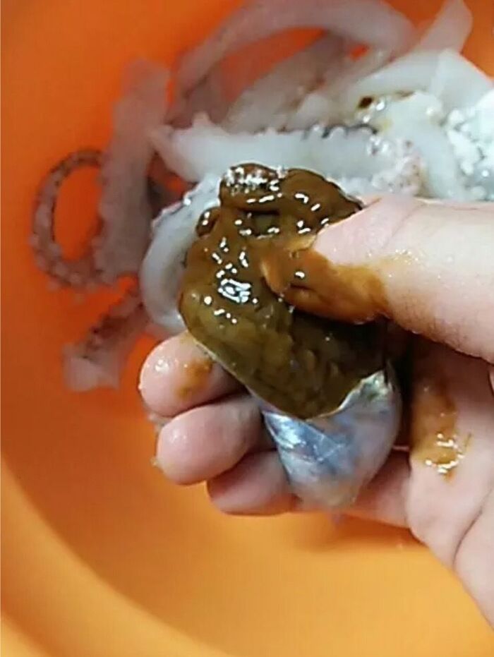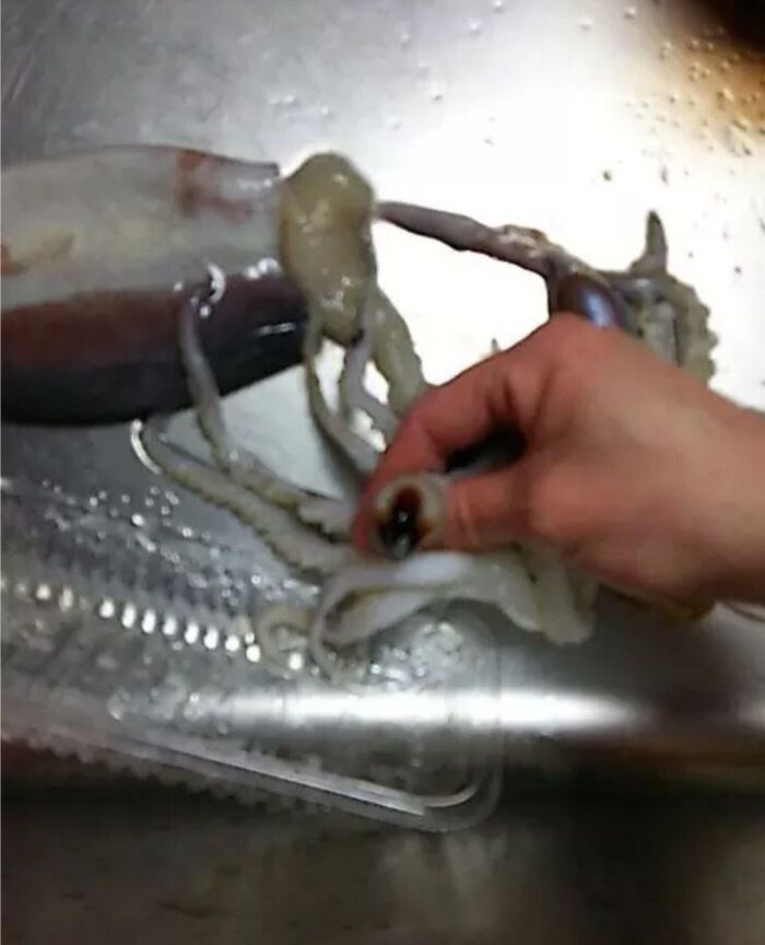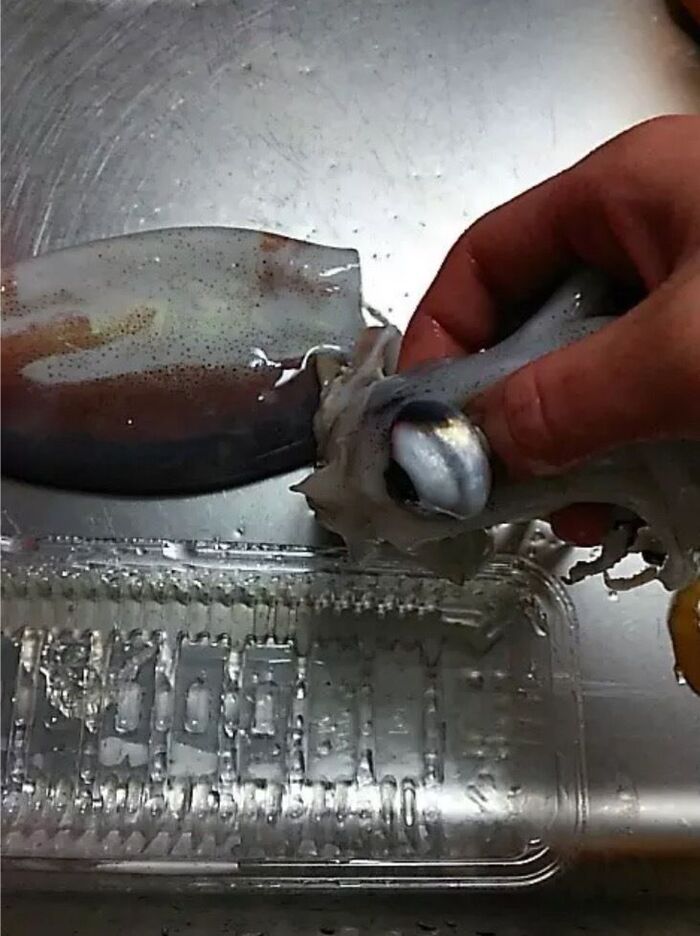 ②イカを水洗いし、わたの部分をとって、中もきれいに水洗いする。