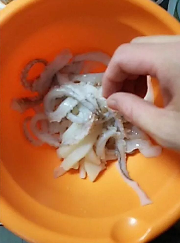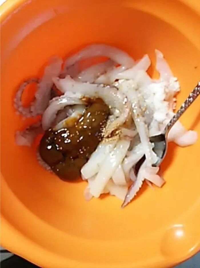 ⑩腹の部分も食べやすい大きさに切って、⑨の足の部分と一緒に、ボールに入れ、塩を加え、少し混ぜる。