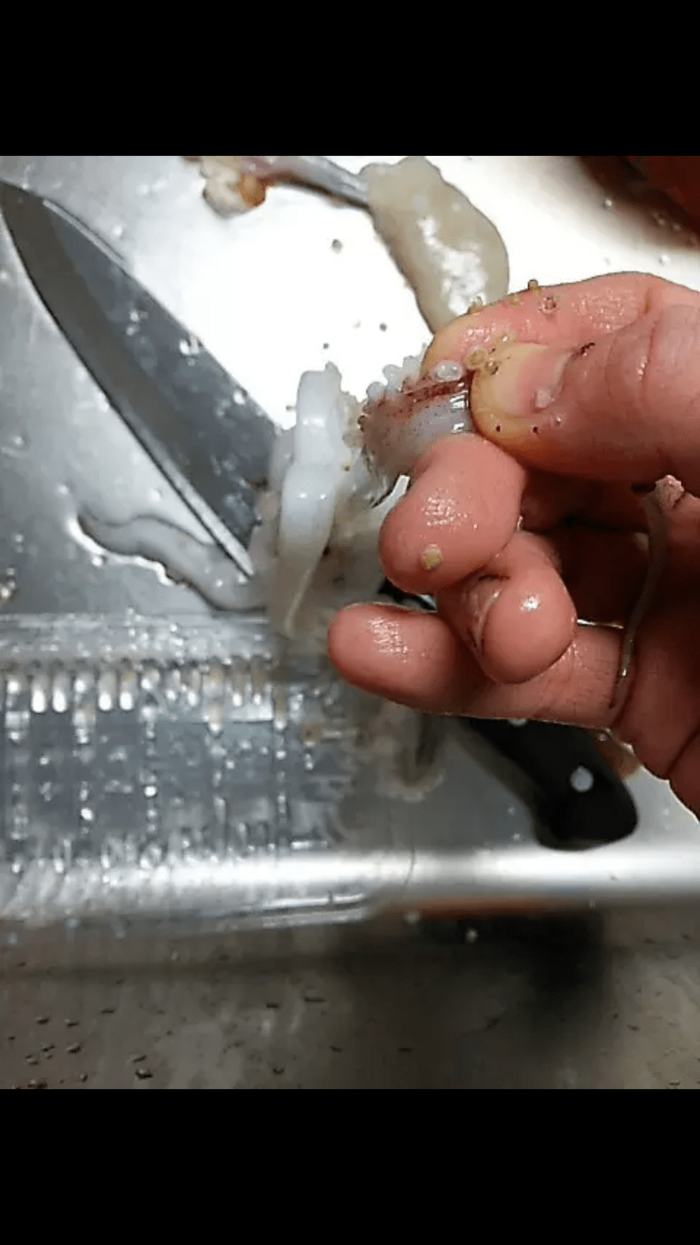 ⑦足の吸盤の中に、かたい殻がついているので、包丁の背の部分で、取る。