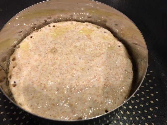 フライパンにオリーブオイル半量を入れ 丸形セルクルを置き生地を半分入れ両面焼いていく