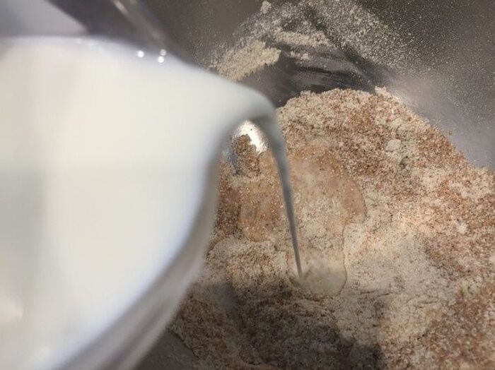 ボウルにふるった全粒粉 塩 砂糖 ベーキングパウダーを入れ電子レンジ600Wで1分温めた豆乳を加え混ぜる