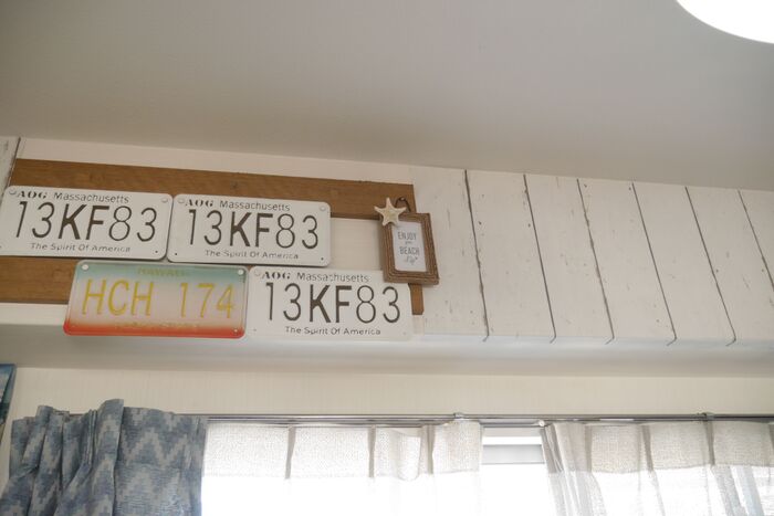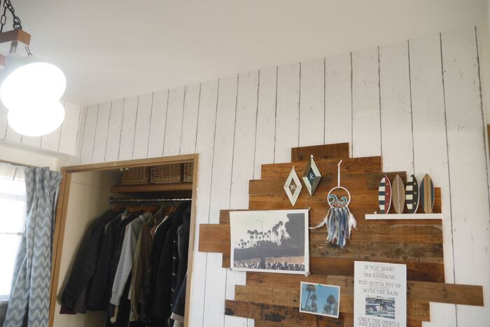 旧居では横向きに使っていたこの壁紙。新居では縦方向に使って板壁風にしてみました。