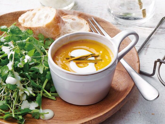ヨーグルトのやさしい酸味が、パンによく合うかぼちゃのスープです。
