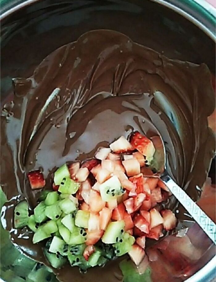④チョコレートが溶けたら、①で切った果物を入れ、混ぜ合わせる。