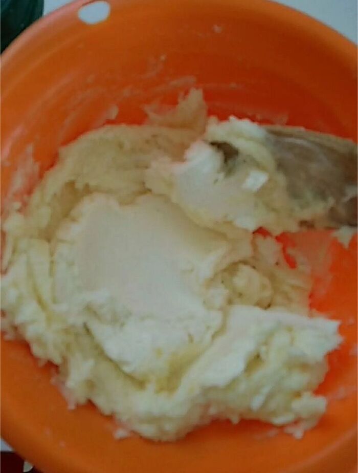 ①ボールに、室温に戻しておいたクリームチーズと上白糖を入れ、ダマにならないように、混ぜ合わせる。
