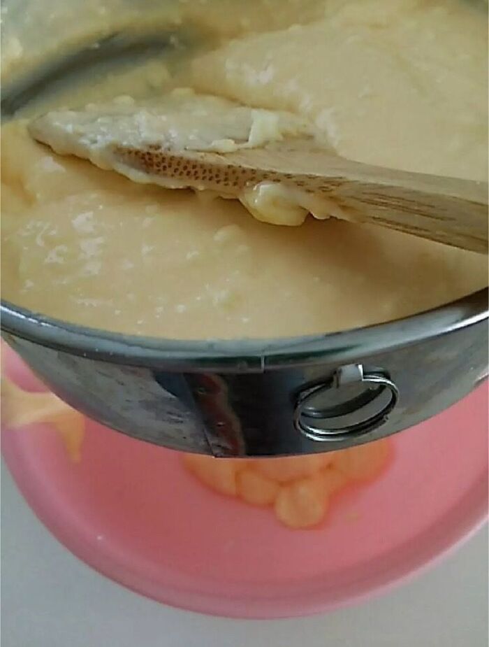 ⑧型に流し入れ、木べらなどで、均一になるようにする。