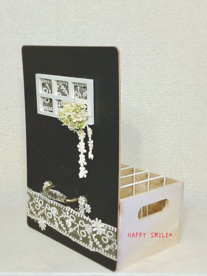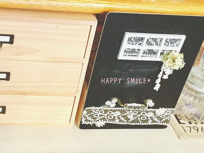 ブラックボードに、レースやミニウィンドウフレーム、造花をくっつけます。