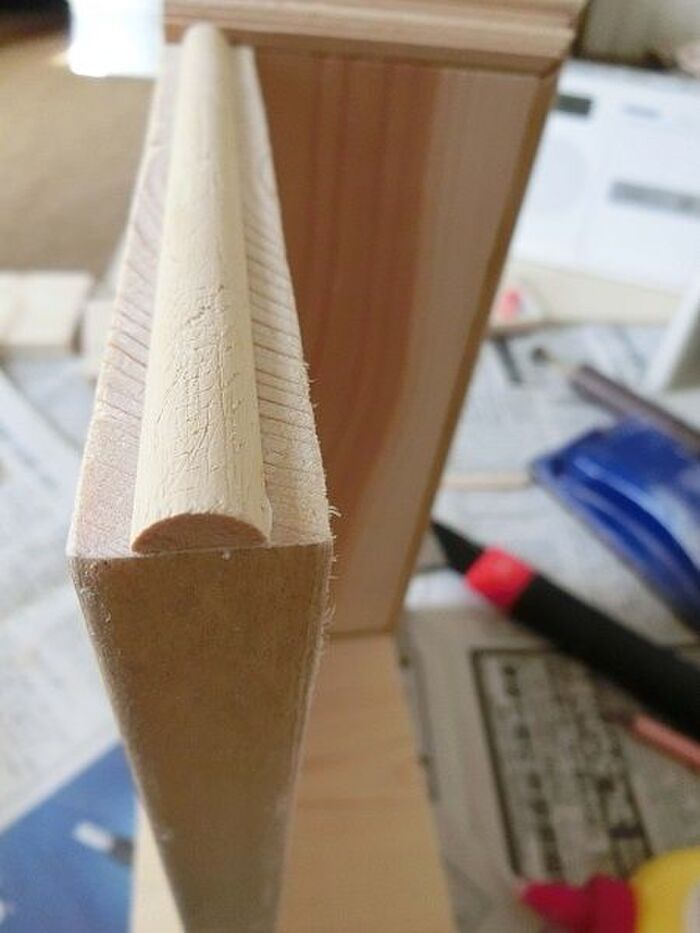 もう一つの板の側面には半円の木を貼ってます。