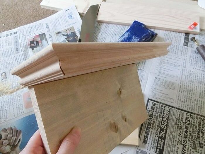 上部にモールディングをボンドで貼ります。