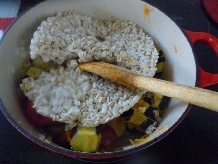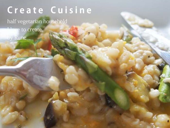 シャキッとした甘みのあるアスパラガスと柔らかい野菜の甘みのハーモニーがプチっとした押し麦とトロリとしたヴィーガンシュレッドとなりますので、押し麦は12分煮こむのでそれ以上火を通しすぎない、また、最後にアスパラガスとヴィーガンシュレッドを入れることを忘れないように。