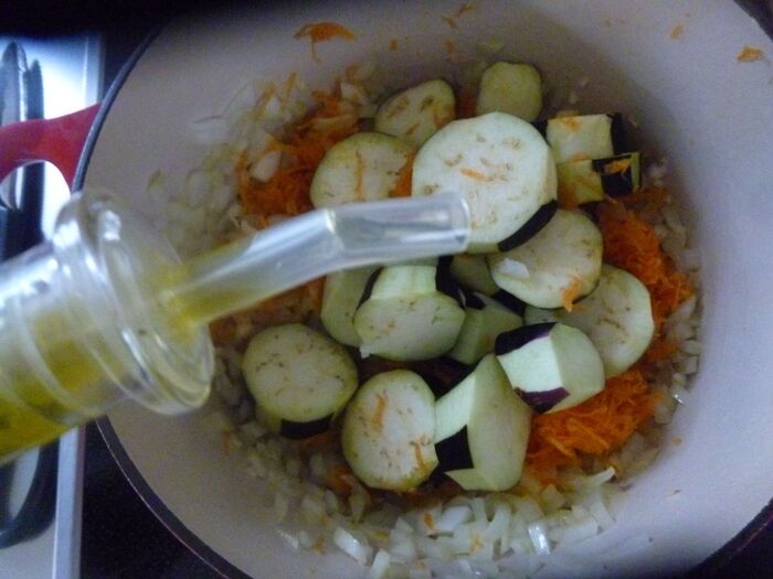 茄子は油をよく吸うのでオリーブ油を少し加える(分量外)