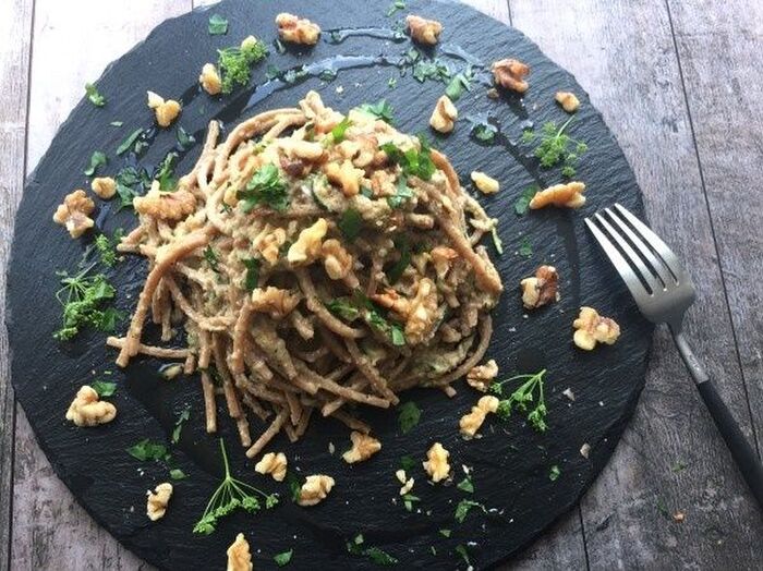 器に盛り付け残りのくるみと刻んだイタリアンパセリをふる