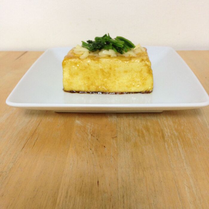 ④豆腐に『私のヴィーガンシュレッド』をのせ蓋をし、『私のヴィーガンシュレッド』が溶けたらできあがり。お皿に盛りつけ、ほうれん草をのせいただきます。