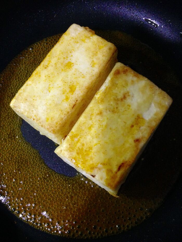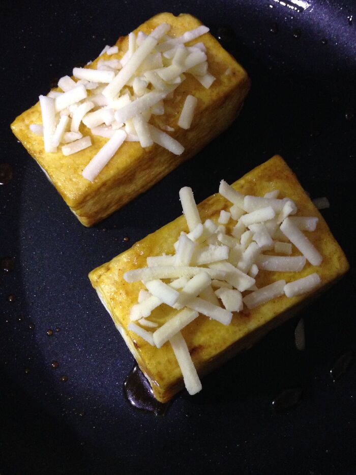 ②豆腐は 1/2に切り、全面に片栗粉をまぶします。フライパンに▽を入れて火にかけ『私のヴィーガンシュレッド』が溶けたら豆腐を入れ、全面に焼き色をつけます。