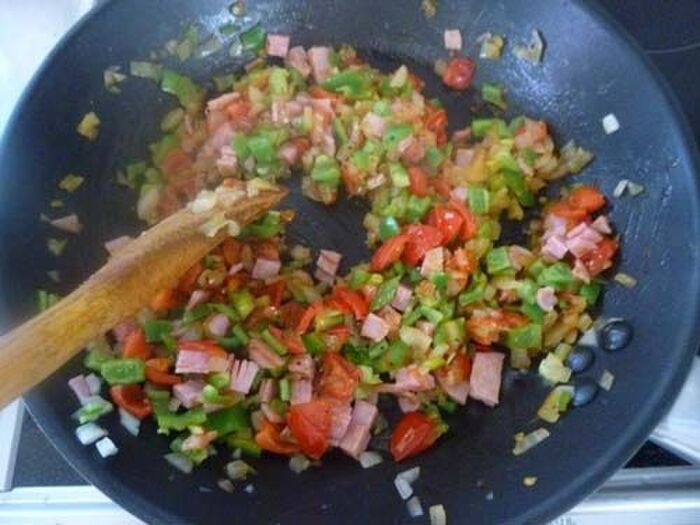 ハム(乳成分不使用のもの)を投入し混ぜ合わせる。