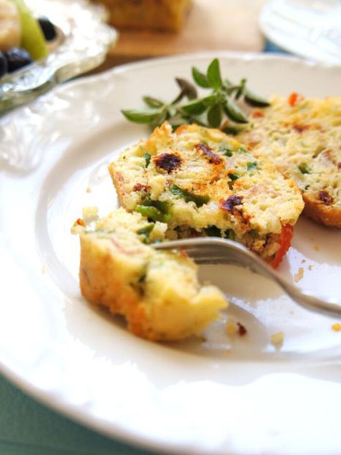 100均で購入した小さ目のパウンド型にグレープシードオイルをぬり④の生地を流す。薄切りに切ったプチトマトを並べる。