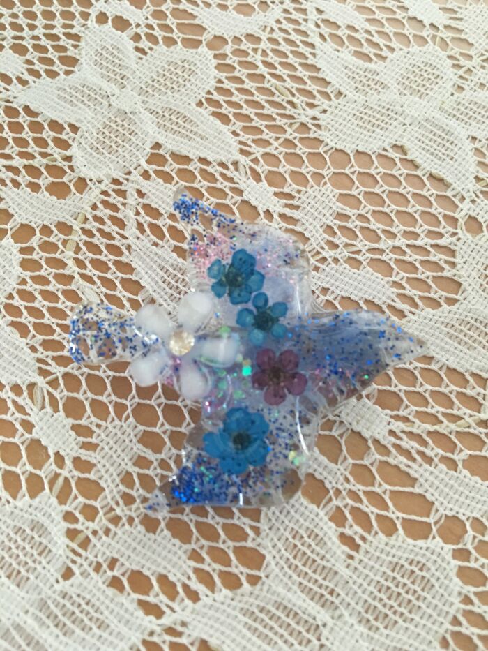 これは折り紙や布ではなく、ラメや押し花やボタンなどのパーツをのせたところにレジン液をのせたものです。