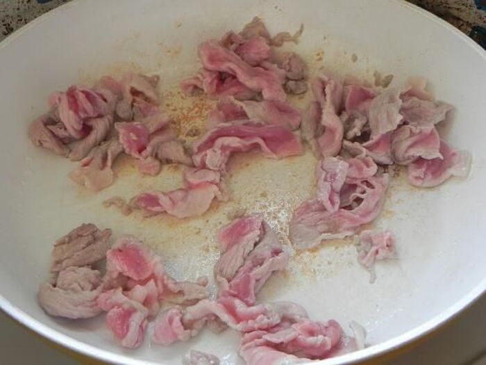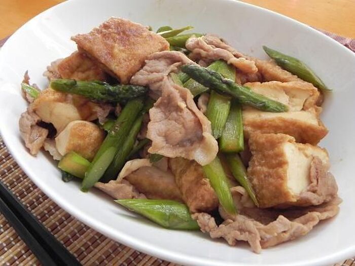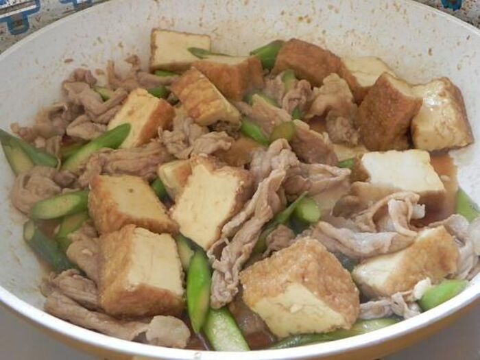肉の色が変わったらアスパラと厚揚げを入れ、★印の調味料を加えます。