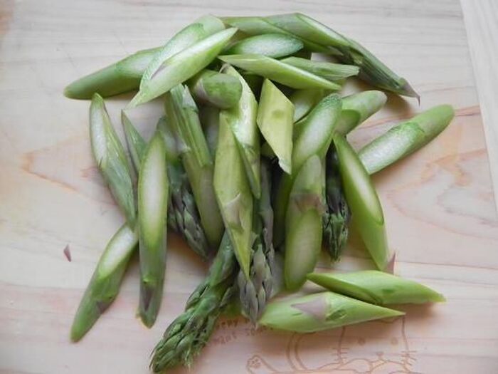 アスパラは根元を少し切り、硬い部分はピーラーでむいて、斜めに2㎝幅くらいに切ります。