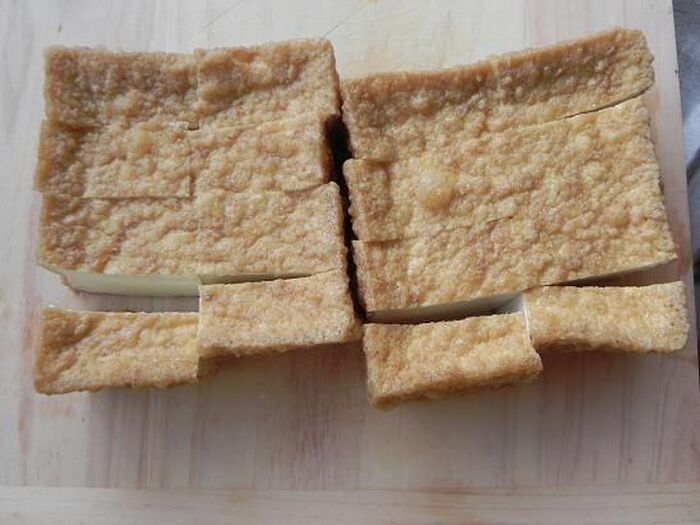 厚揚げは一口大に切り、熱湯をかけて油抜きします。