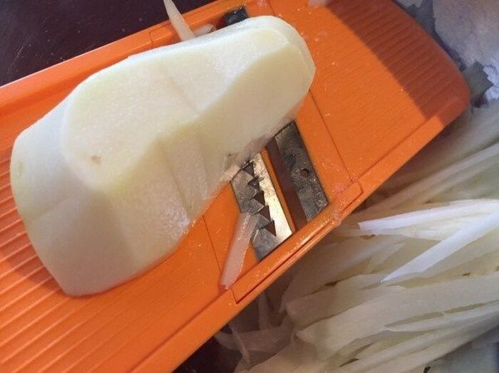 ジャガイモはスライサーで薄く細くスライスして トースターでじっくりと