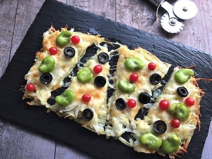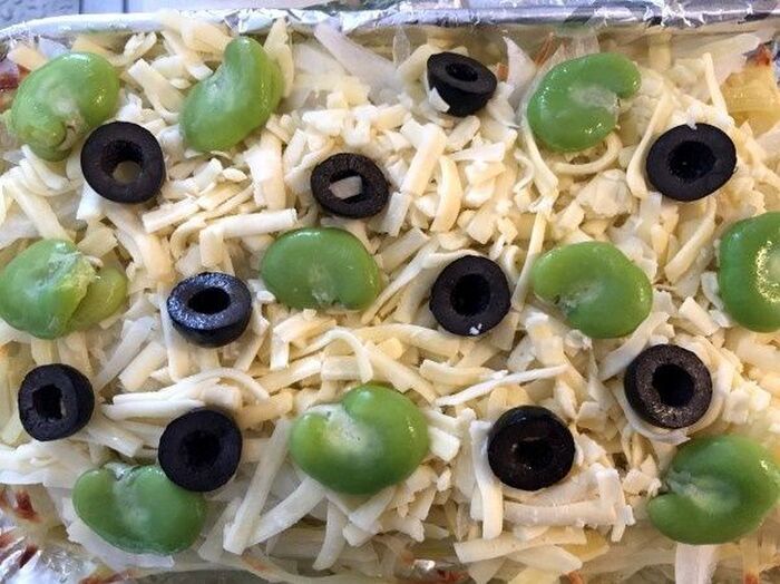 スライスした玉ねぎ チーズをのせ 種を取って半分に切った黒オリーブ 茹でて外皮をむいたそら豆をのせる