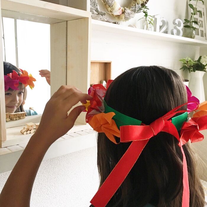 家に帰ると、帰宅した次女が華やかな花冠を見て感動。
