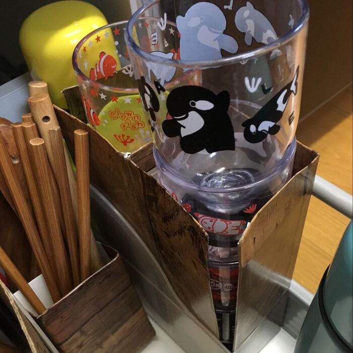 マグカップを重ねられる用に、持ち手が入る部分に切れ目を入れたマグカップ入れに、今は、子供たちが成長したので、プラスチックコップを重ねています。タダ重ねておくよりは、安定してるので使いやすいです。