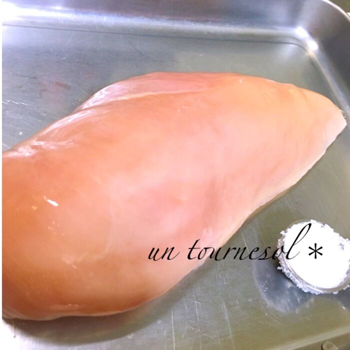 鶏むねの皮と脂をキレイにとり、塩を全体に揉みこみ、約8時間以上冷蔵庫に入れておく。