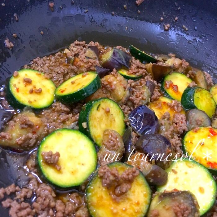 *ズッキーニとナスに、油を吸わせる感じで炒めてください。