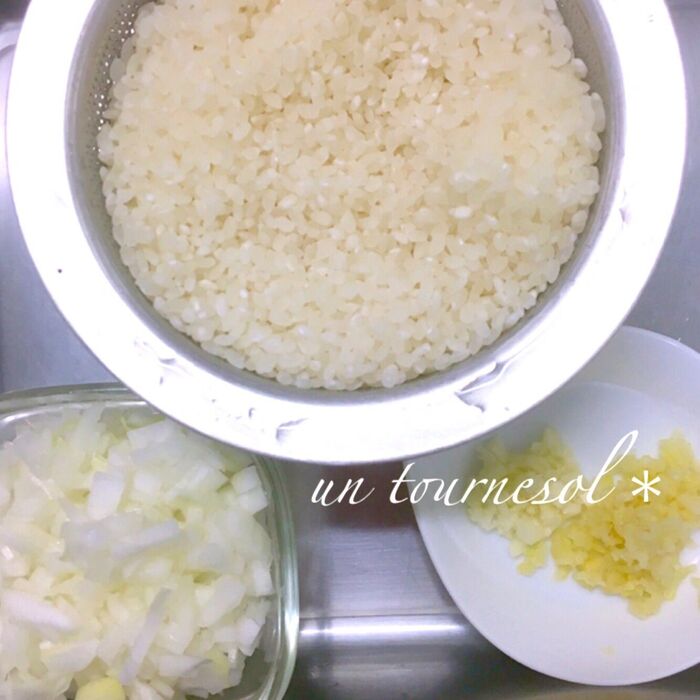 パプリカとピーマンは約1cm幅に縦に切り、玉ねぎとしょうが・にんにくはみじん切りに切って、シーフードミックスは、酒(分量外 小さじ1)をかけてふんわりラップをして600Wで約40秒加熱、米はサッと洗って水切りをしておく。