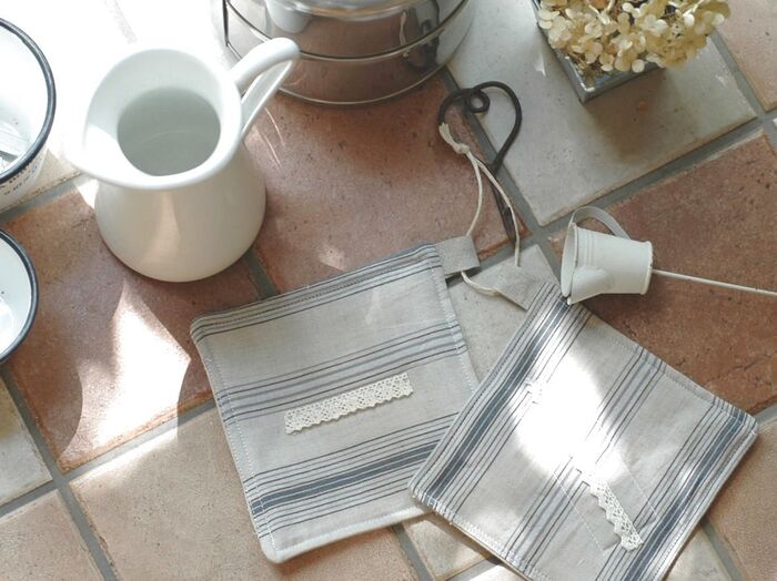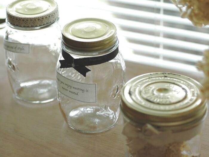 定番のキッチン雑貨、鍋つかみに保存瓶。