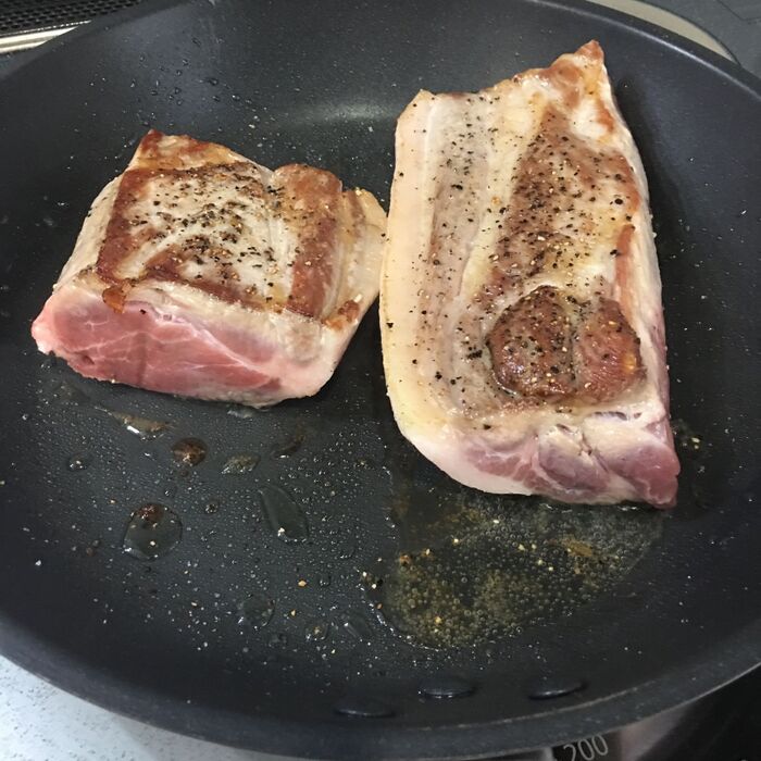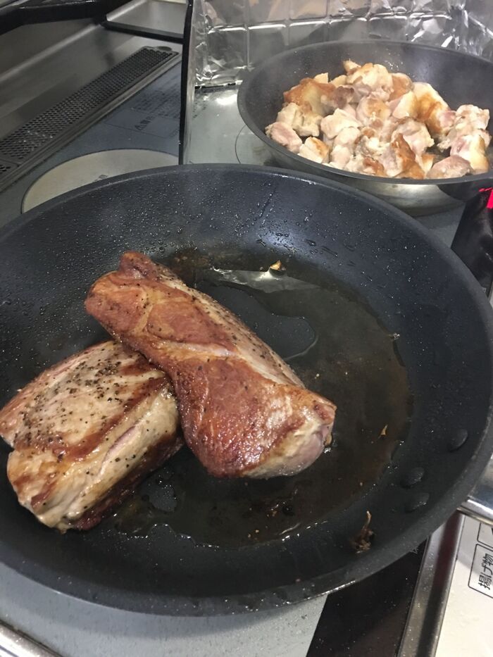 塩胡椒した肩ロースを強火で全面焼き色を付けます。